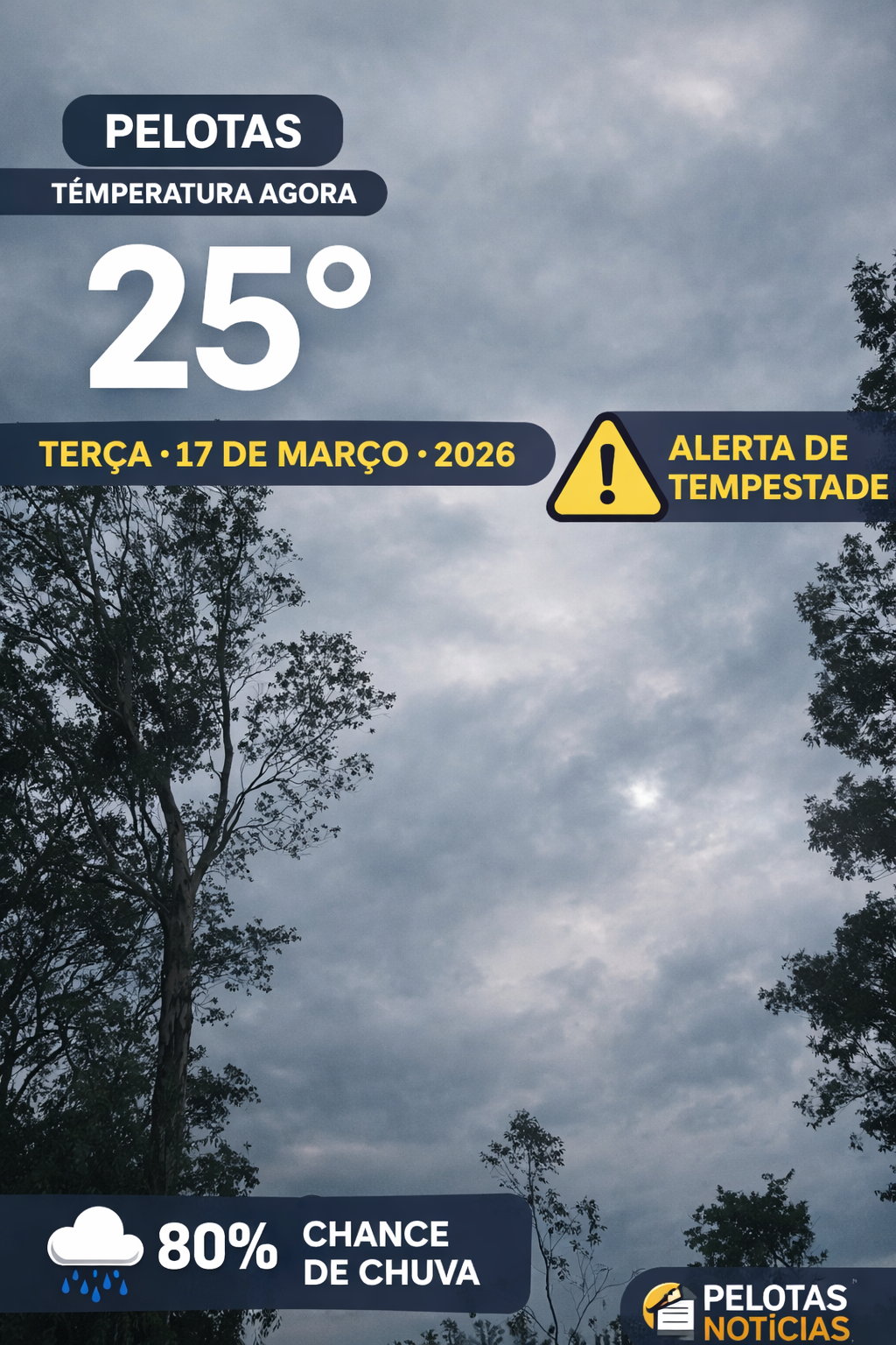 Segundo os dados meteorológicos, a chance de precipitação chega a 80%, podendo ocorrer períodos de chuva acompanhados de vento.