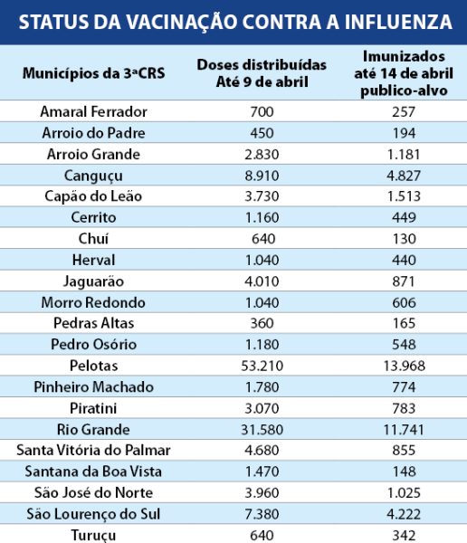 A procura pela vacina contra a Influenza tem sido considerada positiva em todos os municípios, com destaque para os maiores centros, como Pelotas e Rio Grande que lideram em número absoluto de pessoas imunizadas. Em relação ao percentual do público alvo, municípios como Turuçu, São Lourenço do Sul, Morro Redondo e Canguçu estão acima dos 20%. Em contrapartida, Chuí, Santa Vitória do Palmar e Santana da Boa Vista não passaram dos 5% de cobertura vacinal.